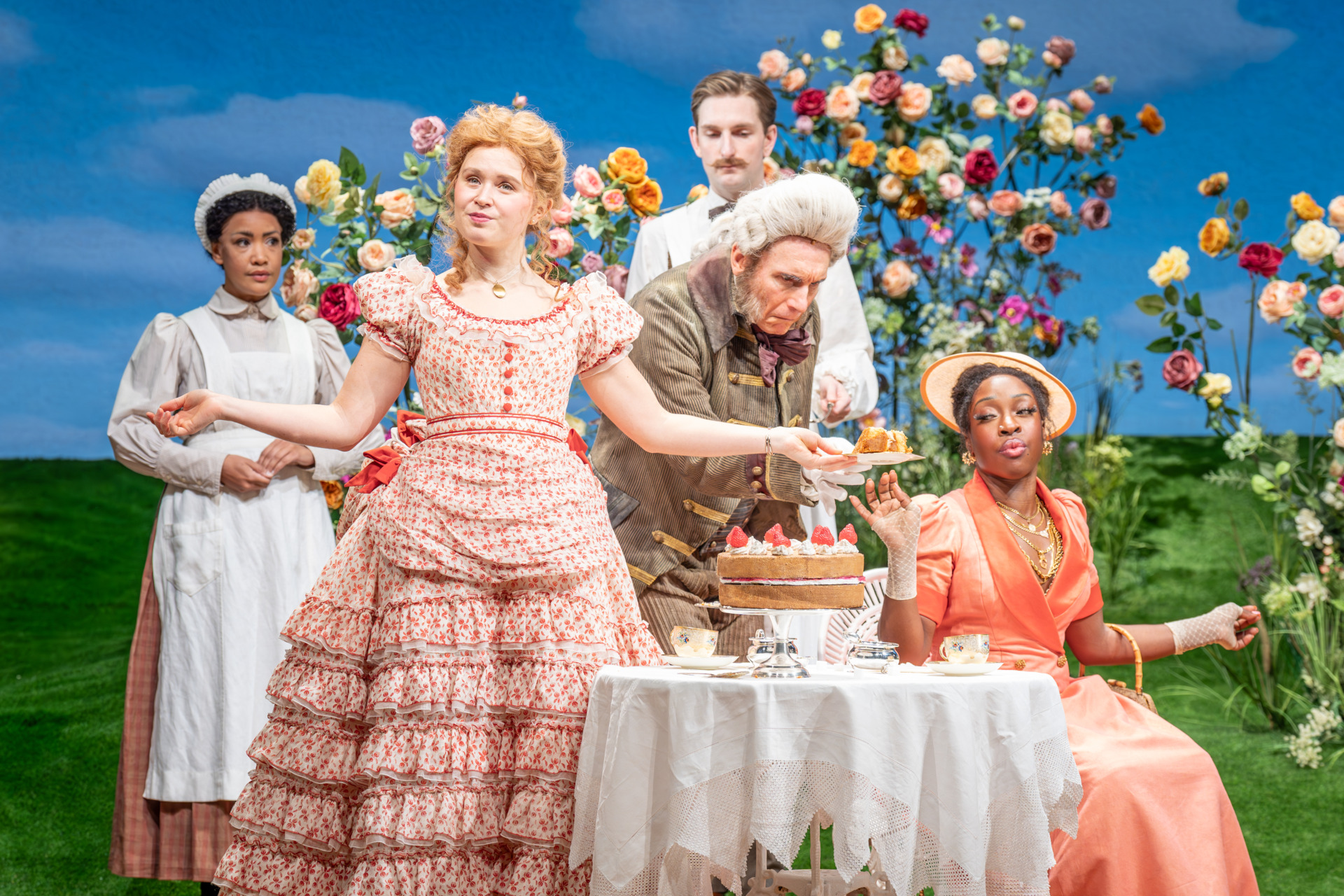 Near inarguably, one of the strongest parts of this production is the casting: It combines familiar names and faces like Ncuti Gatwa (Barbie, Doctor Who), Eliza Scanlen (Little Women, HBO’s Sharp Objects), and Hugh Skinner (Fleabag) with theatrically comedic powerhouses like Sharon D. Clarke and Ronke Adekoluejo. While each performance is individually quite heavy in its theatrics, they’re each so unified in doing so that by the two-and-a-half-hour mark, the Looney-Tunes-esque shenanigans feel almost natural to the audience. After all, who hasn’t wanted to ring-around-the-rosie out of joy?